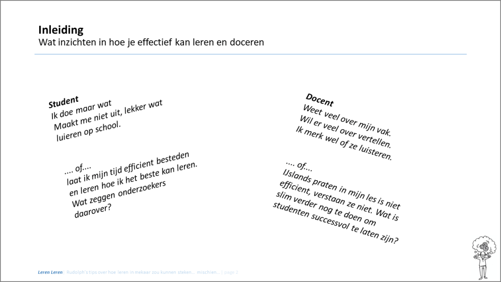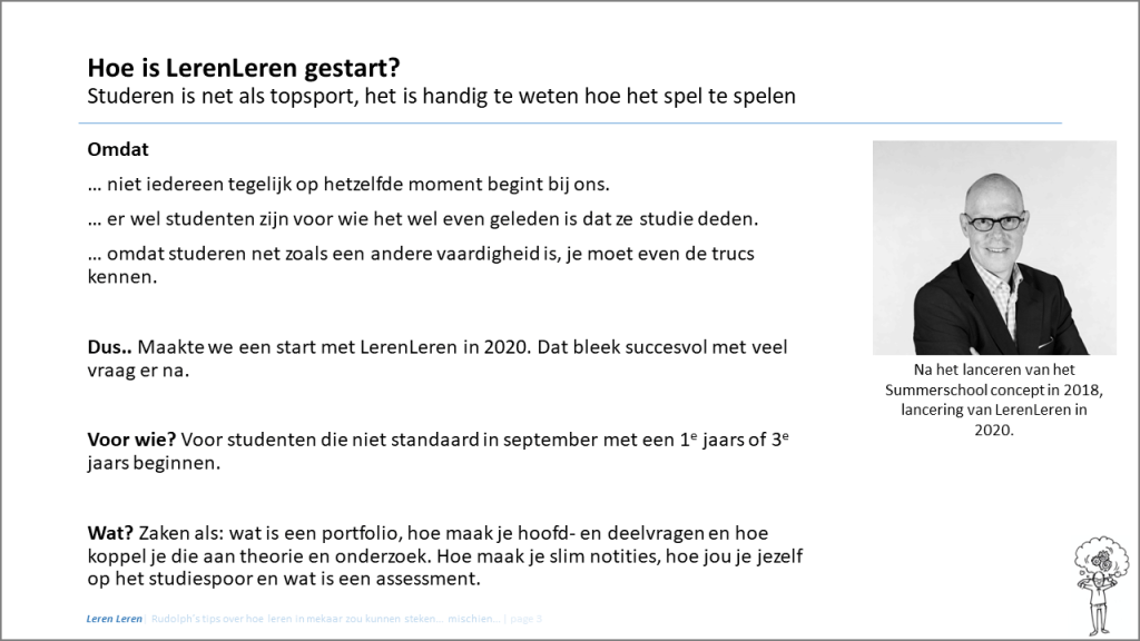 Vanaf 2023 gaat er een variant van LerenLeren zijn voor studenten die in februari van dit jaar starten. Deze studenten starten dus niet in september, maar zijn slim en koppelde hun goede voornemens van het jaar direct aan acite. Ze missen daardoor wel de introducties die september studenten hebben gehad, vandaar een extra ‘Start-up’ dag. Meer daarover ga je elders op deze site lezen. Ik zal daar ook de slides die ik gebruikt heb daar plaatsen.