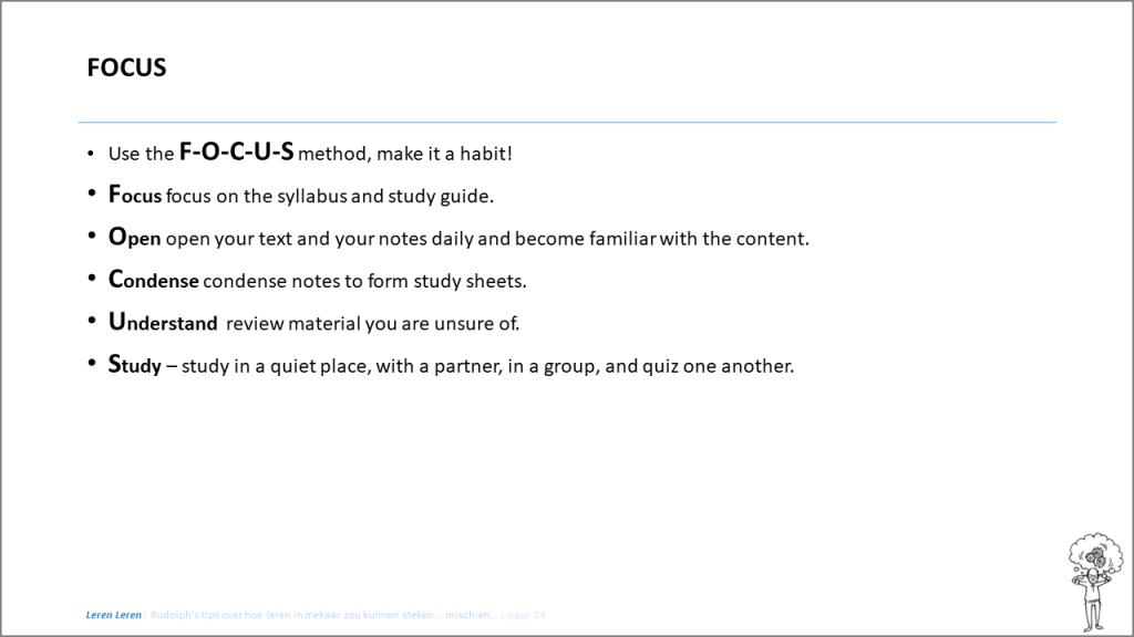 Wat kan je zoal verwachten bij LerenLeren? Hieronder wat slides die een grove richting geven. Meer daarover later in detail op deze website. let op! Dit is geen officiele informatie van een onderwijsinstelling. Slechts in eigen vrije tijd gemaakt door Rudolph Regter om studenten extra support te geven en het makkelijk te maken.