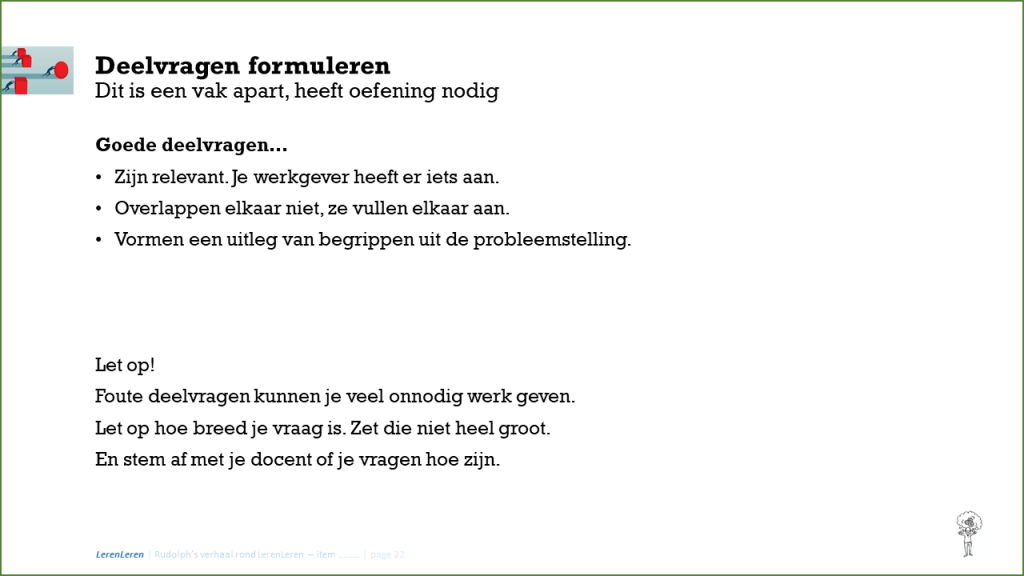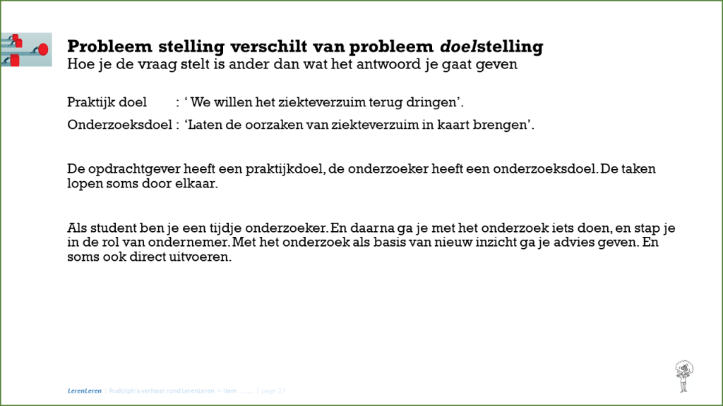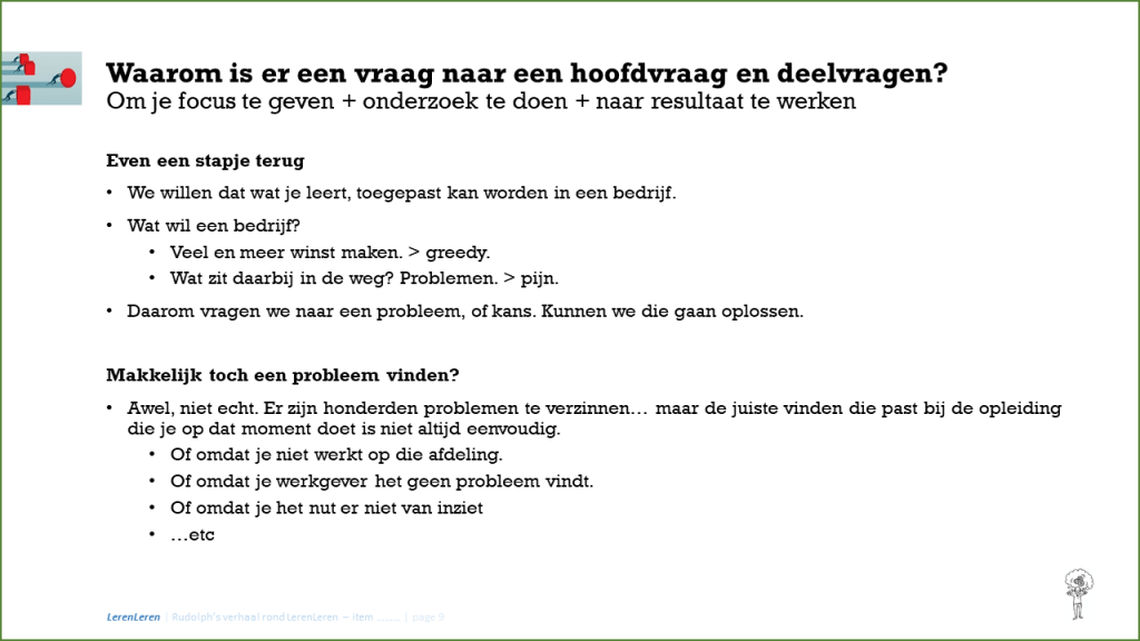 Wat ga je eens als advies aan je firma geven? Hoe ga je ze vooruit helpen? Daarvoor moet je eerst weten wat zou helpen. En helpen bij een vraag die niet gesteld is, tja… dat is wat onhandig en soms niet zo zinvol. Mijn collega docenten gaan je hierbij helpen. Iedere start is voor iedere module namelijk anders. Hieronder slechts in grote lijnen waar je aan kan denken bij het opstellen van hoofdvraag en deelvragen.