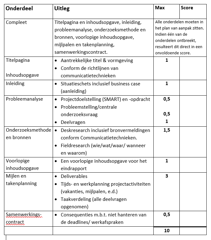 Hieronder een voorbeeld van een beoordelingsformulier die gebruikt zou kunnen worden als een docent naar een Plan van Aanpak kijkt. Lees die door, snap je wat de vraag is? Als niet, vraag het je docent of mij. En de docent zal toch zeker een paar keer tijdens je studie tijd moeten nemen hiervoor. Anno 2025 zou ik denken dat je als student ook even te raden gaat bij een Artifi Intel systeem als voorbereiding op je gesprek met een docent.