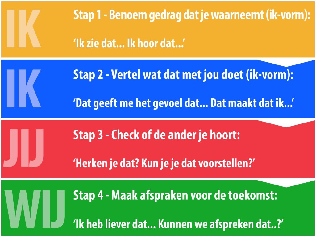 Merk je het verschil tussen “Jij bent een dikke egoïst” en “Als jij heel de tijd met je werk bezig bent, krijg ik het gevoel dat ik niet meer mee tel” . Het eerste roept weerstand op terwijl het tweede misschien tot een gesprek kan leiden. Mensen zijn zich heel vaak niet bewust van het effect van hun gedrag op anderen en vinden het dan ook leerrijk om daar op een neutrale niet-aanvallende manier iets over te horen.